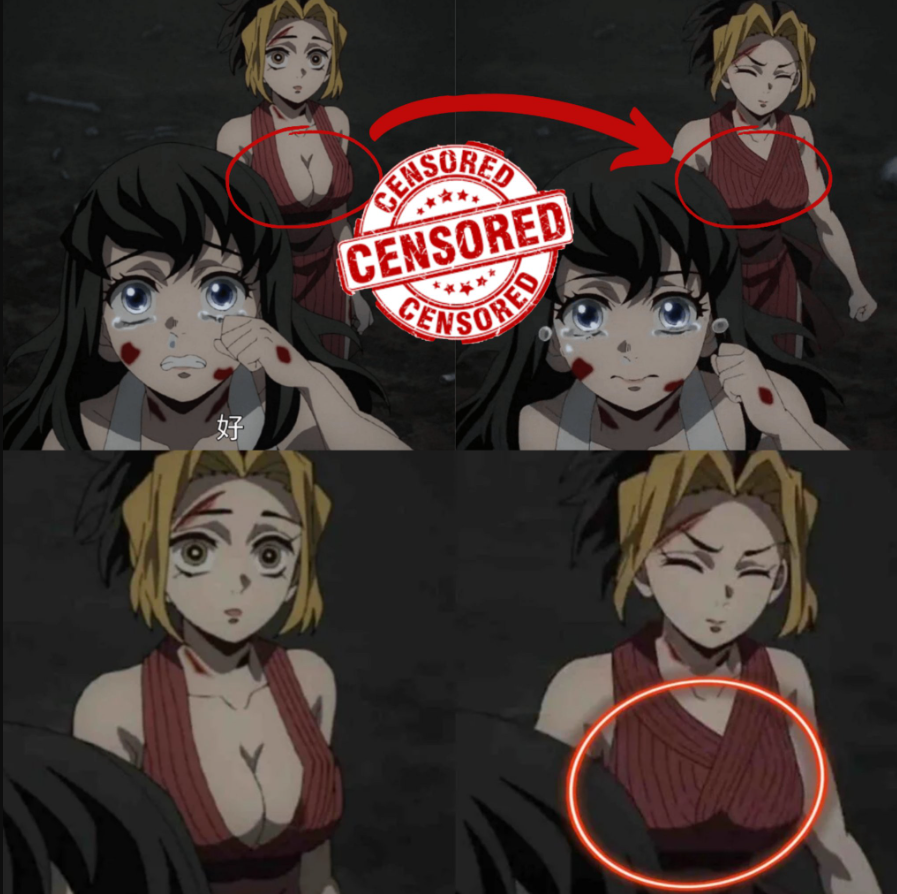 Отмена женской груди и крови. «Клинок, рассекающий демонов» – популярное аниме о подростке Тандзиро Камадо, который стал истребителем нечисти после того, как его семью убил демон. Выжила только младшая сестра Нэдзуко, но она теперь тоже демон. Одноименная манга – одна из самых прибыльных за всю историю. Аниме же смотрят миллионы зрителей по всеми миру, но в ряде стран некоторые моменты подвергаются цензуре из-за чрезмерной жестокости и наготы. Как, например, в Китае – порой перерисовка доходит до абсурда. Сравниваем японскую и китайскую версии «Клинка, рассекающего демонов». На кадре ниже героине перешили платье, чтобы спрятать декольте, и нарисовали не такое отчаянное лицо. Снова борьба с пышными формами! Кровь из носа тоже убрали. Банные процедуры только в закрытом купальнике и без капель, стекающих по телу. Снова говорят «НЕТ» декольте и струе крови из ноги! Конечно же, и эти кадры пропустить нельзя. Вдруг китайский зритель перевозбудится. И снова все прикрыли, даже полунамека на на