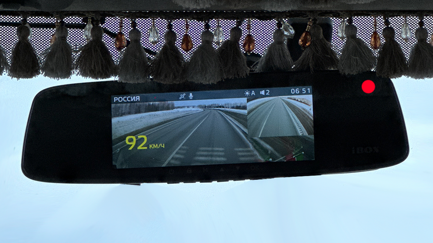 Передняя панель практически безрамочная, всю поверхность занимает зеркало. У видеорегистратора пятидюймовый IPS дисплей. Изображение на нём не блекнет, с какой точки на него не взгляни. Меню видеорегистратора не перегружено настройками.