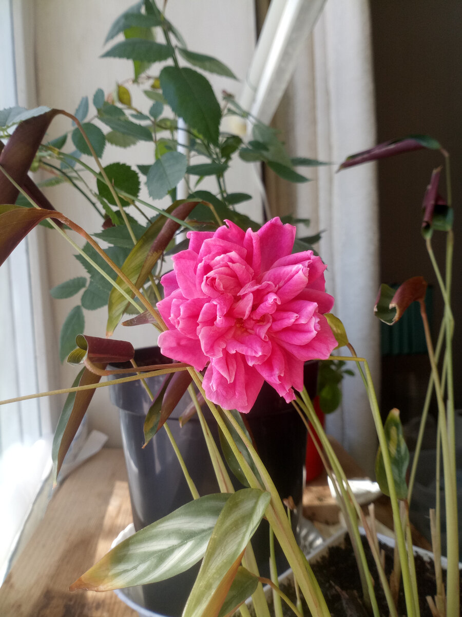 ...хотя и их тоже на подоконниках достаточно :)) В середине марта наконец расцвела моя бенгалочка, осенний подарок дочки на день рожденья. Домашняя роза оказалась яркой и нежной, очень красивой. Я уже писала, что цвет был сюрпризом, и я всю зиму ждала, когда же появятся и раскроются бутоны, чтобы увидеть - ну какая же она все-таки?! А вместе с ней набирали потихоньку цвет подросшие прошлогодние черенки петунии. Посмотрим вместе? :) В первый вечер, когда цветок раскрыл лепестки, мелькнуло сожаление, что не светло-розовая, а вот такая) Но уже на следующее утро я поняла, как здорово, что моя ранняя весенняя роза оказалась ярко-розовой. Жизнеутверждающий цвет! Похожее впечатление на меня всегда производят цветы Розариум Ютерзен. Сияющий розовый, взрыв цвета и радости :) Комнатная розочка, конечно, скромнее. Но после долгой зимы, когда за окном все еще лежит снег и от бесконечных холодов накапливается усталость в душе, действует так же стимулирующе)) Здесь на первом фото в галерее второй бу