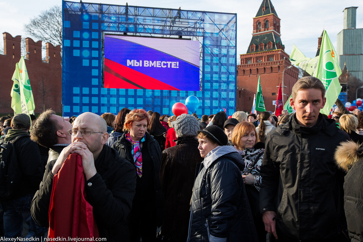 Из разных точек центра Москвы начиная где-то с двух часов дня людские ручейки тянулись в направлении Васильевского спуска. Многих людей собирали на митинг по спискам. Лично видел такие точки сбора ещё в метро. После этого все сбивались в группы по интересам и постепенно двигались по Китайгородскому поезду и далее по набережной в сторону Москворецкого моста. В точности так же как на шествии памяти Немцова. Народу очень много. Гвардейских ленточек было в принципе немало, но не такое запредельное количество как на "Антимайдане". Интересно? Тогда полный фоторепортаж здесь: https://nasedkin.livejournal.com/56209