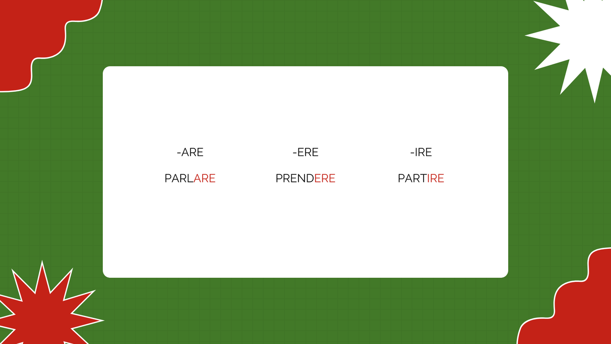 Ciao, stupendi! Я всё-таки решил начать подробный курс итальянского языка в текстовых лекциях, задумываюсь о видео формате, но пока сильно стесняюсь, и не очень понимаю, как их иллюстрировать. А начать предлагаю с глагола! Это не совсем привычная лекция, сегодня мы попробуем привыкнуть к устроиству итальянского глагола, понять некоторые законы спряжения аналогии и т.д. Для начала посмотрим на таблицу ниже, что мы видим? Мы видим, что в итальянской грамматике существует три спряжения глаголов, различаются они гласной в окончании. Итальянские глаголы в начальной, словарной (инфинитив) форме оканчиваются на -ARE, -ERE, -IRE. Отбросив окончание мы можем изменить форму глагола по лицам -я, ты, он, она, но этим мы займемся в другой раз. Пока просто посмотрим, что остается без окончания? Остается основа глагола, чаще всего она оканчивается на согласную: parl-, prend-,part- глаголы, у которых эта основа не меняется называются правильными (regolari) а те что будут менять основу - иногда до неу
