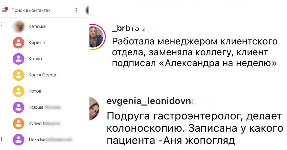 Есть специальные приложения, благодаря которым можно подсмотреть, как другие люди записывают вас в адресной книге. Пользователи из нашего поста как раз подсмотрели и узнали много интересного про себя. 1. "Ухажор" это тот, кто есть уши? 2. 3. Предлагаю теперь так всех проктологов называть. Так сказать, берегите корни русского языка 4. Вареник по акции - мощная кличка 5. Для ассенизатора это ещё вполне безобидно, можно было и похлеще придумать 6. Вот фантазия у людей 7. 8. И всё вроде бы понятно и по делу 9. Алеся-полоскун и Андрей-сосун - отличная пара 10. Зато потом как поняла 11. Иногда даже обидно 12. 13. Почему-то всех тянет на двусмысленность А вы смотрели, как вы записаны у других? Подписывайтесь на наш канал и ставьте 👍, чтобы не пропустить другие интересные посты.