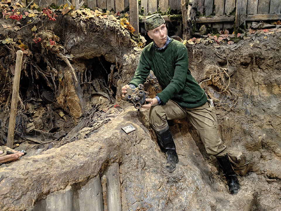 В следующем зале представлен эпизод того же места, но в 1941 году, когда на Невском пятачке были советские солдаты, подбитый танк, а чуть поодаль алая от отражений взрывов Нева.