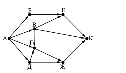 На рисунке – схема дорог, связывающих города А, Б, В, Г, Д, Е, Ж и К. По каждой дороге можно двигаться только в одном направлении, указанном стрелкой. Сколько существует различных путей из города А в город К?