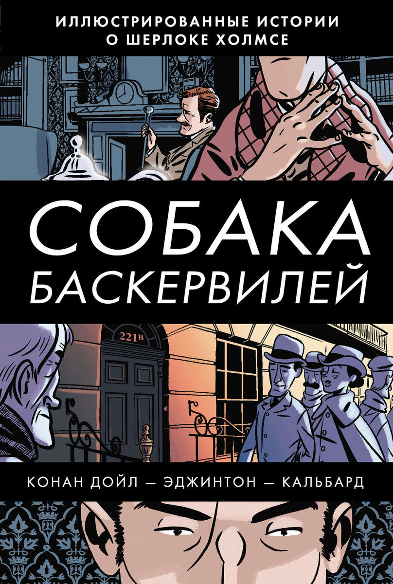 «Собака Баскервилей: Повесть». Артур Конан Дойль, адпт. Я. Эджинтон и И. Кальбард./пер. с англ. А.Банкрашков. - М.: АСТ, 2013. - 144 с. (- Серия «Комиксы»). Тираж 1 500 экз. АСТ также относит это выпуск к серии «Игра в классику», хотя соответствующего оформления и лейбла на нём нет. 📖 ИСТОРИЯ Классика детективного жанра в графической адаптации... Дойль позволил Мориарти убить Шерлока в своём рассказе «Последнее дело Холмса»... Через 8 лет он взялся за «Собаку Баскервилей» и она у него без Холмса не клеилась... История рассказана весьма подробно и увлекательно. 🎨 ГРАФИКА Цветная, рисунок пером с заливкой плоским цветом. Персонажи характерно гротескные. Похоже (по характерной манере изображения лиц персонажей), упомянутый здесь художник И.Кальбард на самом деле - И.Н.Дж.Кулбард ;)... И тогда художника мы уже знаем по нескольким его работам: • Портрет ("Портрет Дориана Грея: Роман-комикс". Оскар Уальд, адпт. Ян Эжингтон и И.Н.Дж. Кулбард. - М.: АСТ, 2014. - Серия "Игра в классику") Н