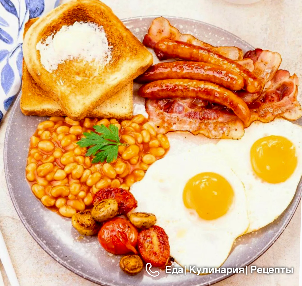 Полный английский завтрак - это распространенный в Великобритании завтрак, основными ингредиентами которого являются яйца, бекон и фасоль Для «сборного» завтрака нам понадобятся: Теперь необходимо аккуратно и красиво все готовые продукты выложить на большую плоскую тарелку, так как этот завтрак очень важная часть британской культуры и целый ритуал. Это завтрак обычно подают с напитками: чай с молоко, апельсиновый сок или кофе. А к тостам фруктовый джем или обычное сливочник масло приятного аппетита🌸