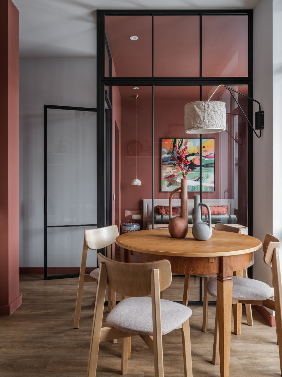 Создавая проект небольшой квартиры, дизайнер Павел Баканов использовал насыщенные оттенки и древесные текстуры. Дополнив пространство интересным декором, получилось организовать самобытный интерьер в современном стиле. Дизайн-проект квартиры создавался для молодой девушки, основным пожеланием которой стала организация современного интерьера, при это важно было сделать все в короткие сроки. Особенность заключалась в том, что заказчица сама занималась реализацией проекта, я только консультировал и давал советы. В результате такой совместной работы нам удалось полностью воплотить все запланированные идеи в жизнь. Для того, чтобы небольшое пространство квартиры получилось более просторным и функциональным, мы использовали стеклянные перегородки, которыми отделили спальню от кухни-гостиной. Также сделали открытый проем и установили окно, получив широкий обзор из прихожей на кухню и балкон. Такой прием позволил объединить все помещения, создать общий объем и впустить солнечный свет в каждый