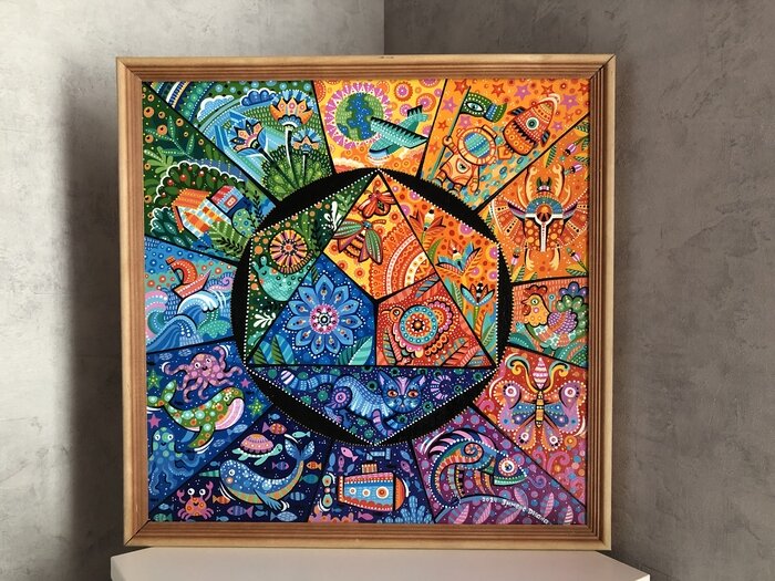 Она была написана совсем недавно, в феврале 2024 года. Мне очень хотелось успеть к выставке сделать хотя бы одну новую большую работу, и так появился «Цветовой Круг №1». Я рисую акриловыми красками и акриловыми контурами.