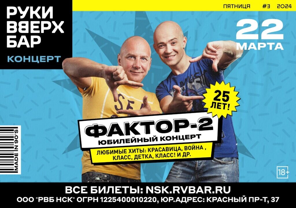 Легендарной группе “Фактор-2” исполняется 25 лет! 22 марта в Руки ВВерх! Бар состоится юбилейный концерт со всеми любимыми песнями этой замечательной группы!«Скажи, красавица», «Весна», «Класс, детка, класс» и многие другие, которые мы слушали на аудиокассетах в тайне от родителей. Все эти песни Илья Подстрелов и Андрей Камаев исполнят на расстоянии вытянутой руки.Торжественное и фееричное погружение в ностальгическую атмосферу на юбилее группы Фактор 2 ,покорившей не одно поколение правдой жизни в текстах своих песен.Сбор гостей: 18:00; Начало концерта: 20:00КУПИТЬ БИЛЕТ ЗДЕСЬ! Бронь стола: 8 (383) 383 60 37Новосибирск, Красный проспект, 37 window.yaContextCb.push(()=>{ Ya.adfoxCode.create({ ownerId: 1487166, containerId: 'adfox_171091305763023809', params: { p1: 'cyull', p2: 'frfe', pfc: 'glnht', pfb: 'spzbm' } }) }) Реклама. Рекламодатель ООО «РВБ НСК» Источник с
