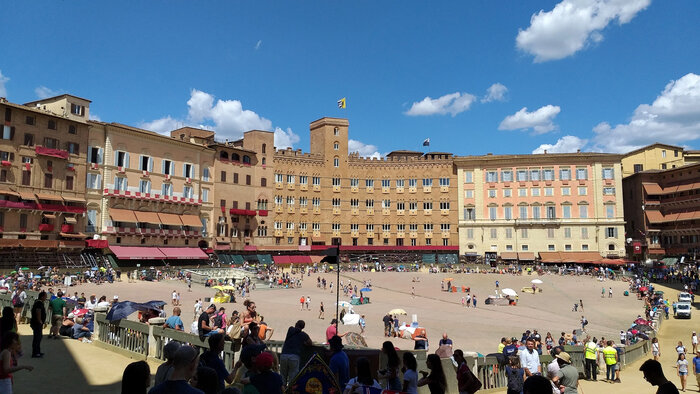 Тут я понял, что настало время Гугла... Вбив дату 16 августа я увидел , что здесь сегодня проходит Сиенское Палио о котором я , к своему стыду я толком ничего не знал. Я лишь вспомнил, что когда то читал книжку в которой про него вскользь рассказывали. И вот сам того не осознавая , я оказался среди участников сего великолепного действа!Сиенское Палио—это традиционные скачки , проходящие в Сиене дважды в год: 2 июля и 16 августа. Весь город поделен на 17 контрад(районов) - в состязании 2 июля участвуют 7, не принимавших участия в июльских скачках предыдущего года, плюс три из оставшихся 10, которые определяются жребием, всего же стартуют 10 участников; такой же порядок действует и применительно к августовским скачкам. Каждая контрада имеет свой герб и традиционные цвета, в которые одевается представляющий её всадник. Как раз эти флаги контрад я и видел развешеными на зданиях в разных частях города.