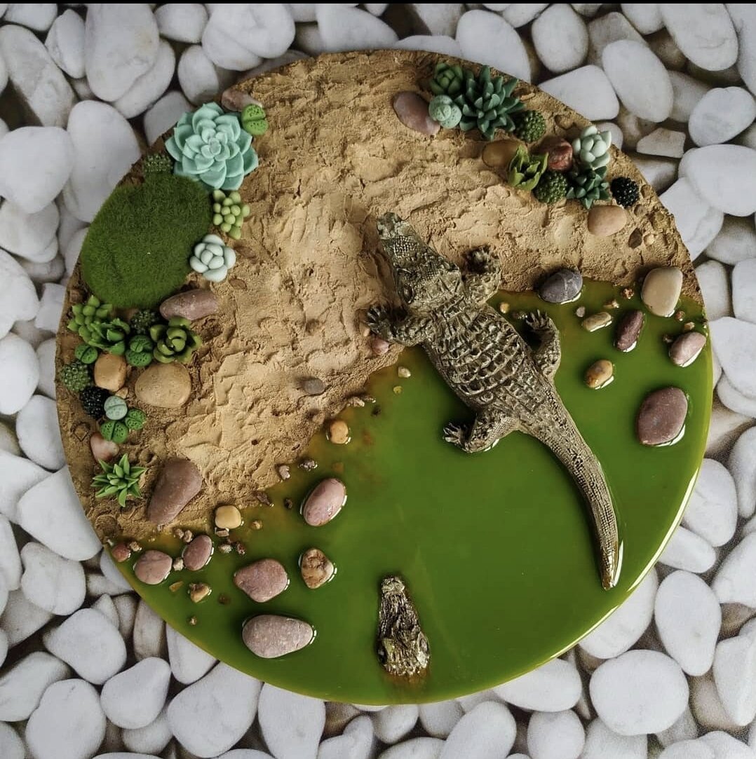 Для создания этой работы мне пригодилось всё 😁, вернее, очень много самых разных факторов. И акриловые краски🎨, давно заброшенные и забытые. И кисточки 🥢с мастихинами. И собранные уже давно камушки, ракушки, речной песок. И холодный фарфор, и моё умение лепить из него различные растения, в том числе суккуленты🌵 Перчатки и большие деревянные палочки, которые я приобрела специально для занятий шугарингом😁 И моё высшее художественное образование, хотя я не рисовала уже больше 10 лет🙈. И любовь к эпоксидной смоле, которой я никак не могла найти нужное применение. Но самое главное – и это стоИт отдельно от всего списка - это вдохновение. Желание создать нечто необычное В результате — родилась эта чудесная картина "Крокодилы у реки". Размер 30х30 см. Картина в наличии Если вам понравилась и вы хотите её заказать – пишите в комментариях🤗 💚💚💚 #вдохновение #эпоксиднаясмола #эпоксиарт #резинарт #картина #смола #крокодил #крокодилвреке #mirfantasy_наличие