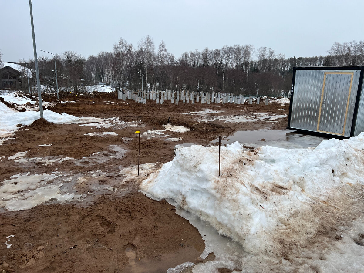В продолжение статьи про стоимость временной площадки из дорожных плит сразу представим пример такого процесса. У нас имеется коттеджный поселок, в котором уже сделана дорога из дорожных плит. Но на участке, где планируется строительство дома, из-за мартовского таяния снегов сплошной ужас - ни заехать, ни выехать. А надо ведь завозить и разгружать материал. Принято решение сделать временный заезд из дорожных плит. У нас есть уже бытовка на участке. На углу участка стоит геодезический репер. Из земли торчит водопроводная труба. В таких условиях планируем сделать въезд под углом к основной дороге, чтобы обойти эти препятствия и упростить заезд автомобилей на участок. Приезжает трактор-экскаватор и снимает грунт для последующего устройства песчаной подушки и укладки дорожных плит. Толщина плиты 170мм и минимальная толщина песчаной подушки 100мм, поэтому чтобы дорожные плиты въезда оказались примерно на одном уровне с плитами основной дороги по поселку, нужно срезать 270мм земли. Так как