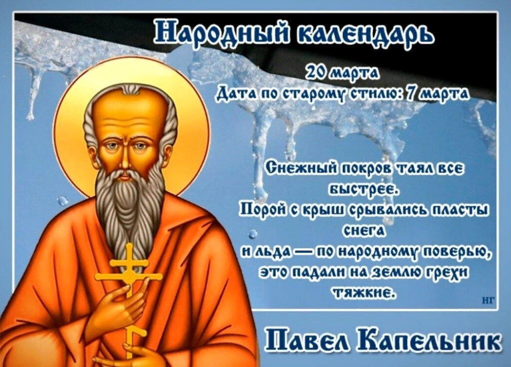В народе данный день называли Павел Капельник, поскольку весна вовсю вступала в свои права. На улицах падала вода с крыш, звенела капель. Однако нужно было не забывать и про зиму, потому что в любой момент могли ударить морозы. Оттого так и говорили: «С крыш капает, а за нос цапает!».