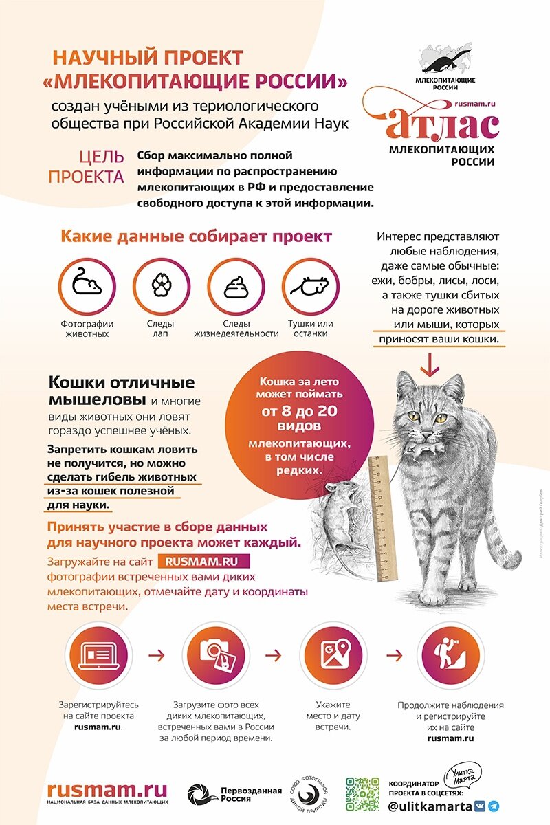 Дорогие владельца котов и кошек, в особенности – живущие в сельской местности. А вы знали, что ваш питомец может стать очень ценным помощником в сборе научных данных для учёных? На сайте проекта «Млекопитающие России» специалисты собирают информацию о встреченных животных. Интерес представляют любые наблюдения, в том числе и самых обычных видов. Так же в призыве помочь организаторы отмечают, что кошки – отличные охотники, и многих зверей добывают гораздо успешнее учёных. Подробности и инструкция о том, как стать участником научного проекта, есть на карточке ниже, а также на сайте: https://rusmam.ru/atlas/map