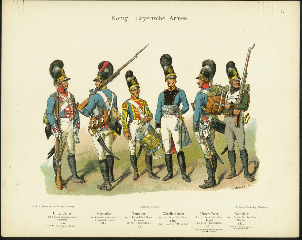 Униформа пехоты была необычной в двух аспектах. Во-первых, в эпоху, когда большинство армий германских государств носили тёмно-синюю или белую форму, король Максимилиан одевал своих людей в традиционный васильковый цвет Баварии. Во-вторых, венчал эту униформу раупенхельм ー высокий чёрный кожаный шлем с чёрным гребнем, называемым гусеницей. Несмотря на то, что этот головной убор был очень по вкусу баварцам, а также защищал голову от сабельных ударов, он был тяжёлым, громоздким, а меховой гребень во время дождя впитывал воду, как губка. Зато унтер-офицерам было очень удобно хранить в нём свои записные книжки.
