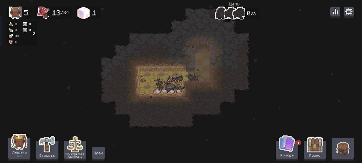 В нижнем правом углу кроме выхода из муравейника находятся кнопки Колода и Перки. Про колоду я рассказывал в первой части, а сейчас мы разберёмся в перках. Это бонусы, которые можно получить выполняя определённые задания. Пять перков в игре можно получить посмотрев две рекламы за каждый из них. После получения перка, он разблокируется навсегда и на всех уровнях. Одновременно активированными могут быть только три перка, но в любой момент их можно поменять на другие из открытых. У каждого перка есть своё особое задание. Некоторые из них можно выполнять, переходя с уровня на уровень. Например, чтобы получить перк Хищники, нужно суммарно убить 750 насекомых грузчиками и разведчиками. А такие, как перк Королева танцует, можно получить, накормив королеву 5555 единицами еды за одну игру, то есть если игрок начнёт проходить другой уровень, не закончив это задание, то ему придётся начинать сначала. Большая часть перков в обмен на бонусы могут ослабить муравьёв в чём-то другом, например перк Грузоподъёмность даёт строителям возможность носить на один ресурс больше, но уменьшает их скорость передвижения на 60%.