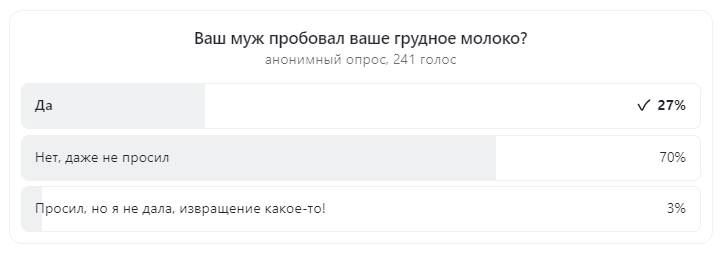 Я, накануне проводил свой опрос среди подписанных на меня девушек, давали ли они пробовать своим мужьям грудное молоко. Приняли участие в нем не так много людей, что понятно, тема щепетильная. Но результаты оказались вполне предсказуемыми: решились попробовать молоко лишь четверть мужчин.
