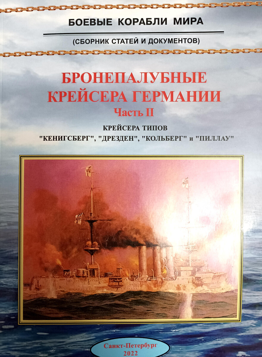 По названию понятно, что это вторая книга из цикла посвященного немецким бронепалубным крейсерам. Для тех кто хочет вспомнить предыдущий выпуск - может обратиться к его обзору, который я делал почти год назад, в мае 2023 года, ссылка - ТУТ . В первой части рассмотрены корабли от крейсера "Ирене" до крейсеров типа "Бремен". Здесь же, как уже видно из названия - предлагается познакомиться с крейсерами четырех типов: "Кенигсберг" - 4 единицы, "Дрезден" - 2 единицы, "Кольберг" - 4 единицы, "Пиллау" - 2 единицы. Учитывая, что это не все построенные для кайзеровского флота крейсера такого класса, то можно предположить, что нас ожидает минимум еще одна часть, а если издатели и авторы-составители решат продолжить данную "историю" и на 20-30-е годы, возможно мы увидим и следующие крейсера этого государства.