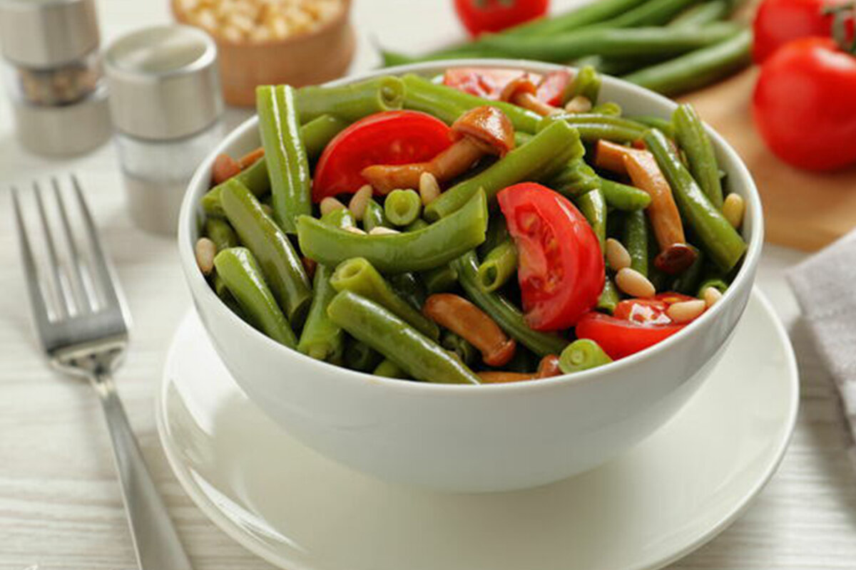 Рецепт приготовления этого блюда в пост простой. Фасоль следует отварить в течение 2-3 минут, откинуть на дуршлаг. Помидоры нарезать на крупные кусочки, кинзу порубить, а грибы промыть кипяченой водой, слив жидкость. Все ингредиенты перемешать, посолить и посыпать кедровыми орешками.