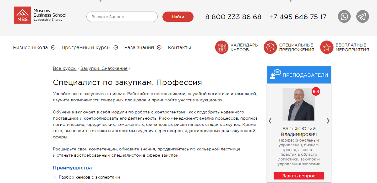 1. Курс «Специалист по закупкам. Профессия» от Moscow Business School (сайт школы)