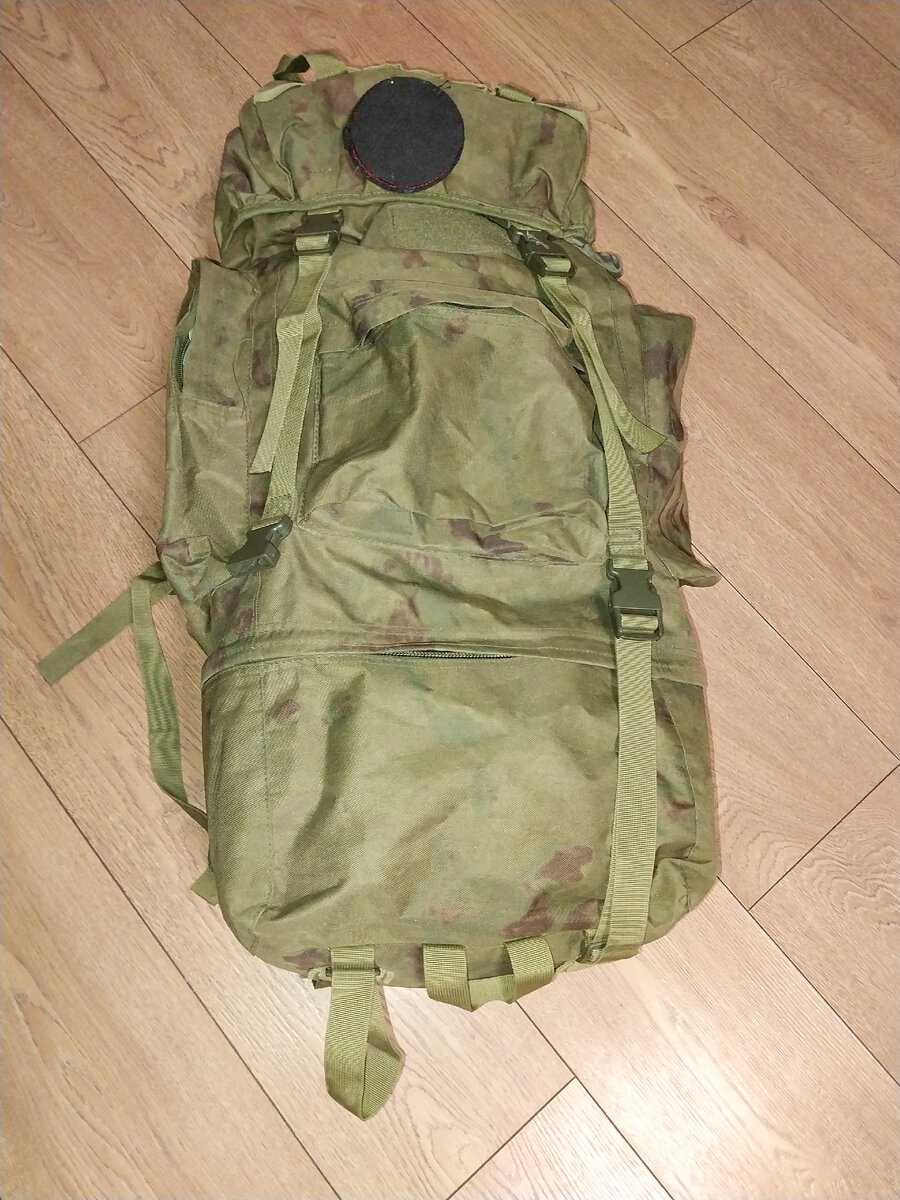 Всего рюкзака два: рейдовый - маленький и основной - большой, под весь шмурдяк. В этой статье будем говорить о большом рюкзаке. Попользоваться довелось разными рюкзаками, начиная с классического советского туристического, было время и вещмешок эксплуатировал и баул. Вещмешок по объему все же ближе к рейдовому. Постепенно пришел к пользованию более современными рюкзаками, до этого был рюкзак с объемом 90 литров, этот меньше, но удобный, с дюралевым каркасом. Внешние карманы: два боковых, один с лицевой стороны, два на верхнем клапане. В одном из верхних карманов влагозащитный мешок на лямке. Низ рюкзака расстегивается, есть возможность отделить нижнюю часть внутренней тканевой перегородкой со стяжкой. Сверху тоже есть увеличивающая объем, утягивающаяся шнуром, тканевая вставка. Удобные широкие лямки, хорошие спинные и поясная подушки. Съемная, регулируемая по высоте подвесная система. При перевозке в транспорте лямки можно снять, а на спинную часть натянуть влагозащитный чехол,