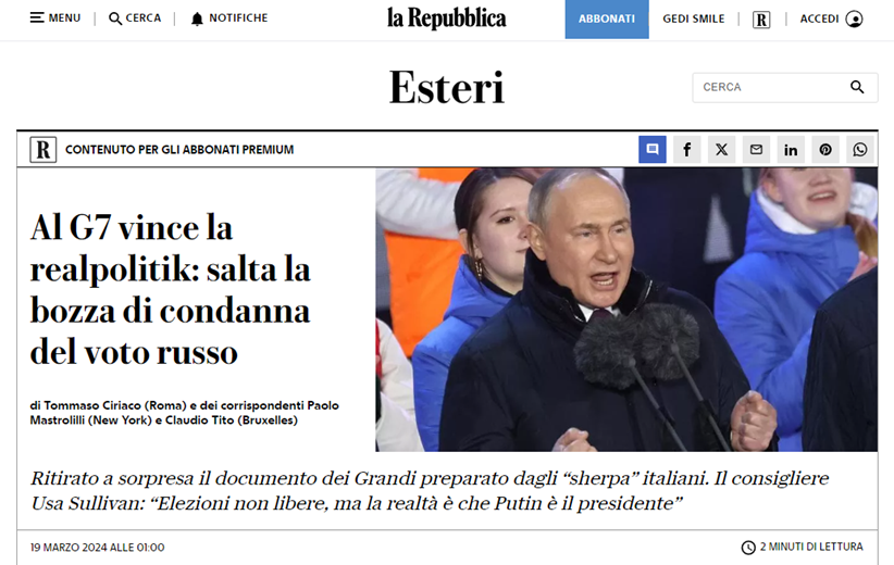 Госсекретарь Энтони Блинкен заблокировал текст заявления стран G7 с осуждением состоявшихся в РФ президентских выборов, сообщает итальянская газета La Repubblica со ссылкой на источники. В этом году в G7 председательствует Италия, и текст заявления был подготовлен ее представителями. Однако формулировки в черновике Госдеп счел неуместными. «Указание США застало всех врасплох», - пишет издание. Блинкен, который участвовал в саммите Большой семерки в формате видеоконференции, уже в ходе встречи дал понять, что его страна не будет давать дальнейших комментариев, говорится в статье. При этом журналисты отмечают, что документ получил предварительное одобрение советника по национальной безопасности США Джейка Салливана. Издание полагает, что причинами стали разногласия между Блинкеном и Салливаном, а также опасения Госдепа о якобы возможном вмешательстве России в предстоящие президентские выборы в США. В самой Италии также разошлись в оценках относительно выборов в России, что спровоцировал