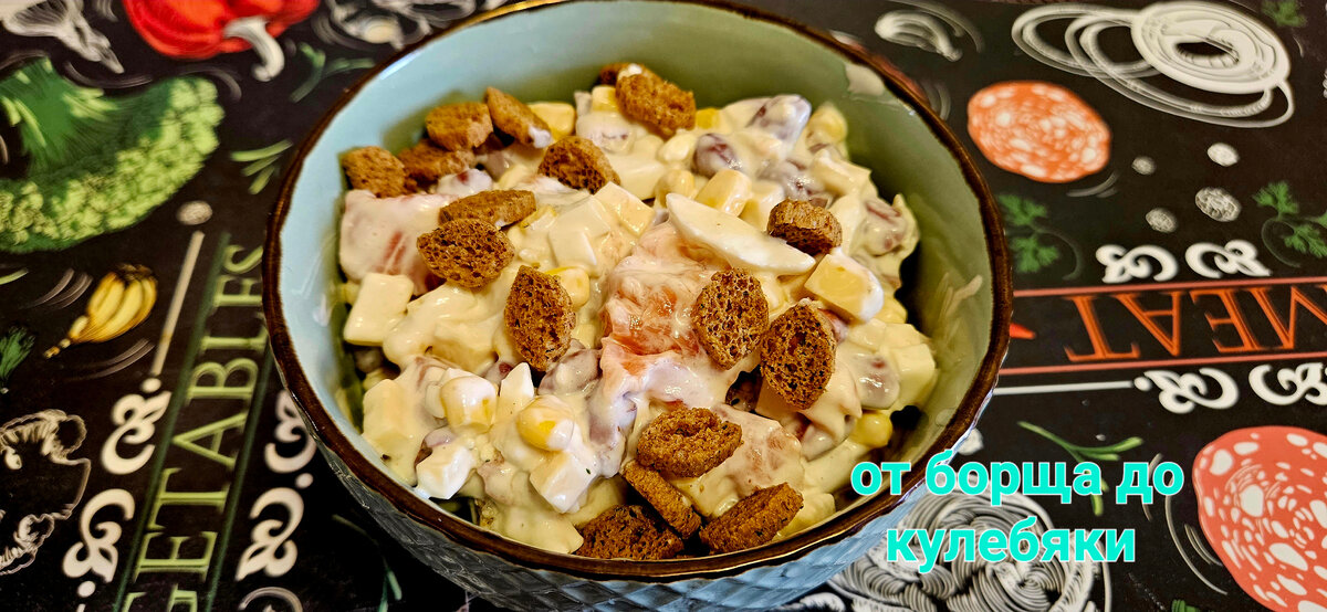 Понятие "сложный салат" подразумевает в себе что-то долгое, кропотливое и дорогое, но это далеко не так, или, во всяком случае, не всегда так. А вот сотворить кулинарный шедевр из обычных продуктов - это настоящее искусство, требующее знания и навыков, хоть и небольших. Сегодняшний "сложный салат", не смотря на его определение, приготовить будет совсем не сложно, а результат порадует вас и ваших гостей. И так. приступим. Рецепт: Для соуса: Время готовки - 15 минут. Сыр перетираем на тёрке, или просто нарезаем маленькими кубиками. На маленькие кусочки режем рыбу и яйца. Сливаем с кукурузы и фасоли всю жидкость и отправляем в салатницу, вместе с рыбой и яйцами. Теперь нужно приготовить соус. Для этого в сметану кладём соевый соус, горчицу, давленный чеснок и хорошенько перемешаем. Заправляем салат соусом, добавляем перец, соль и перемешиваем, после чего подаём на стол, присыпав сухариками. Соус можно сделать как из сметаны, так и из майонеза, пропорции те же. Если вы выберете майонез, то