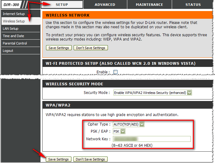 В старых моделях роутеров (такие, как DIR-300, DIR-320, DIR-615, DIR-651), как правило, прошивка не переведена на русский язык и представлена в таком оранжево-сером дизайне. Чтобы сменить пароль, необходимо зайти в настройки роутера (если не получиться войти, то см. это), и открыть раздел "Setup/Wireless setup".