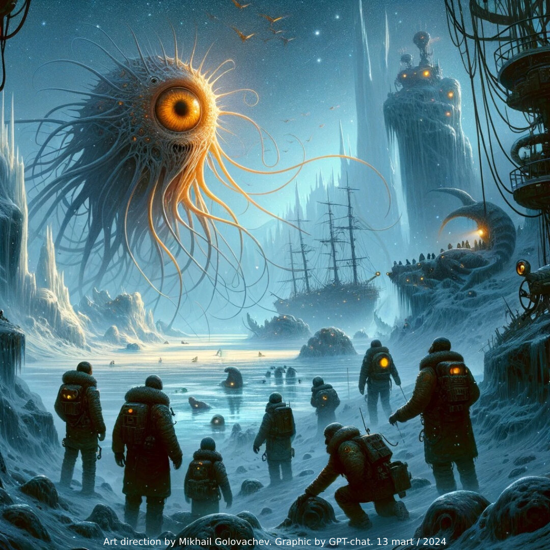 Искусственный интеллект под моим чутким руководством создал иллюстрации к рассказу Стивена Бакстера "Золотые реснички". Я решил, что это будет гигантская серия, посвященная научной фантастике. К слову сказать, не так давно ей увлёкся, раньше как-то не воспринимал всерьез этот литературный жанр. И вот, между прочим, после прослушивания подкастов "Модель для сборки" очень вдохновился многими писателями из этой сферы. Естественно, для работы с ИИ - это идеальное поле для творчества. Я попросил машину разобрать произведение по частям, или страницам, намекнул на вдохновение аэрографией Гигера.