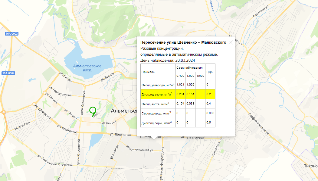 Анализ показал очередное превышение по диоксиду азота. На пересечении Шевченко — Маяковского этот показатель с 7:00 20 марта составил 0,234 мг/м3 при допустимом значении в 0,2. К обеду значение упало до 0,151 мг/м3. Данные опубликованы на сайте Гидрометцентра Татарстана