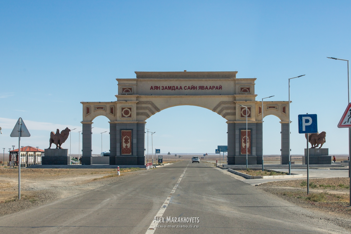 Покидаем край динозавров, аймак Умнеговь — грандиозное сооружение на границе областей желает нам приятного путешествия.