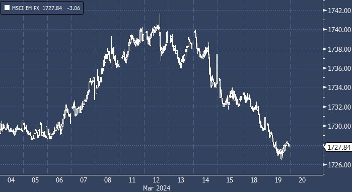 Потери валют стран EM "в основном отражают беспокойство по поводу риска более ястребиного политического послания ФРС сегодня вечером после очередного месяца разочаровывающих данных по инфляции в США за февраль", - сказал Ли Хардман, валютный стратег MUFG. "Мы по-прежнему ожидаем, что председатель ФРС Пауэлл выскажется в поддержку снижения ставок, что может принести некоторое облегчение валютным рынкам EM, особенно высокодоходным carry trades".