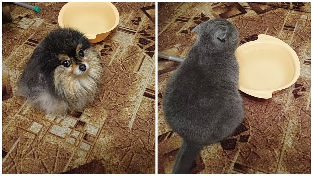 Проводили мы с Милой маму и теперь можем, наконец, спокойно передвигаться по квартире. Потому что – мама приезжала не одна!!! Я не знаю, но как люди держат дома таких огромных собак? Это же не пес, это мамонтодав какой-то!!! Целых 2 кг безудержной мощи и ярости. Страшно, очень страшно – я, сын и Мила передвигались по стеночке. Потому что, было целых два варианта – или нас задавят, или мы))) Мила так вообще жила в страхе... Куда ее скромные 5 кг супротив 2х, чуть не растерзали кисоньку! Совместное фото сделать не получилось, пришлось делать коллаж на фоне миски с водой, чтобы вы оценили размеры и ужаснулись. Представили, каково это – целую неделю ожидать нападения огромной и свирепой собаки. Да собака Баскервилей просто новорожденный щенок по сравнению с Хатей! Вы видите эти глаза? Эти хищные и здоровые челюсти? Вооот, вам от одного только взгляда стало не по себе, представляете, как мы с кошкой боялись? Сегодня мы с Милой восстанавливаемся, переводим дух, радуемся, что нас не съели. А