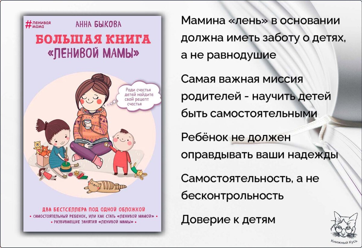 Все советы Анны понятны и просты. Иногда настолько, что я думала: а зачем вообще об этом говорить? Пока не прочитала примеры. родительство отнимает много сил, времени и, что уж говорить, мозгов. Многие вещи забываются, испаряются из головы. А такая книга, как "Большая книга ленивой мамы", напоминает о том, куда ты вообще направлялся.