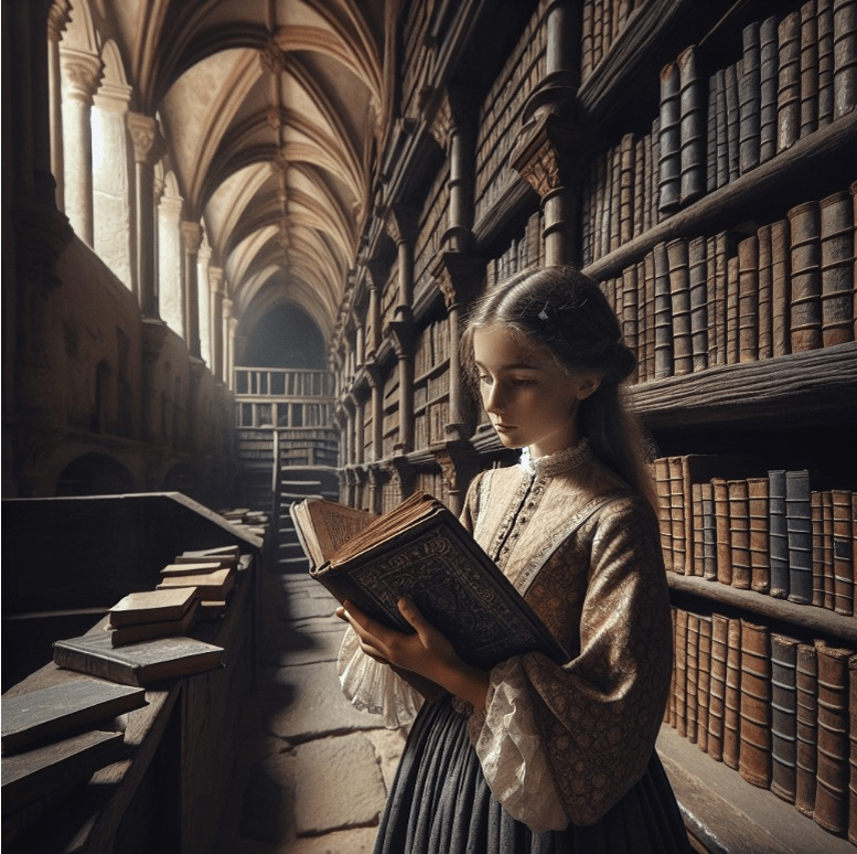 В королевстве, где волшебство шепталось в листве, а мечты танцевали на ветру, среди зачарованного леса была спрятана библиотека. В ее священных залах хранился фолиант необычайной силы — Говорящая Книга. Однажды девочка по имени Анна пошла на прогулку. Девочка, с ее зоркими глазами и духом авантюризма, пробиралась сквозь густую листву волшебного леса. Когда солнце пробилось сквозь полог, Аня наткнулась на таинственную дверь. Она была не похожа ни на одну из тех, что она видела раньше: покрытая затейливой резьбой и мерцающая слабым светом. С неподдельным любопытством, Анна нерешительно протянула руку, чтобы прикоснуться к двери, но обнаружила, что поддаться ей практически невозможно. Глубоко вздохнув, она со всей силы толкнула дверь и шагнула в тускло освещенную комнату, которая, казалось, тянулась целую вечность. Это была древняя библиотека, наполненная пыльными томами и забытыми знаниями. В воздухе витал запах старого пергамента и магии, и Анна почувствовала, как по ее жилам пробежала