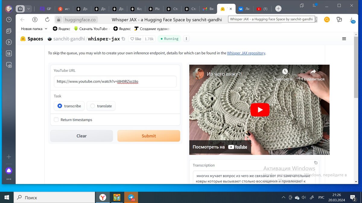 Переведем видео с ютуб канала в текст. Ссылка на нейросеть: https://huggingface.co/ В данном случае ролик про вязание ковров. Автор, надеюсь, не обидится, сделаю ссылку на канал Оксаны: https://www.youtube.com/watch?v=i8H9RZio18o Получился текст: "Многих мучает вопрос - из чего же связаны вот эти замечательные ковры, которые вызывают столько восхищения и привлекают к себе внимание? Ну что я Вам могу сказать - конечно, это шнур, причем полиэфирный. Я вяжу ковры, в основном из шнура 5 миллиметров сердечником. Вот, смотрите - внутри каждого шнура можно вытащить еще один тонкий шнур, где-то бывает сердечник не в цвет, то есть белый внутри розового, но чаще всего производители стараются сердечник, этот шнурочек внутри, делать в цвет основному шнуру. Если мне нужен ковер по-тоньше, то я использую шнур 3 миллиметра и уже без сердечника, то есть он бывает кругленьким бывает плетеным бывает вязаным и плоским, все зависит от производителя и его манеры плетения вязания шнура. вот вблизи они.