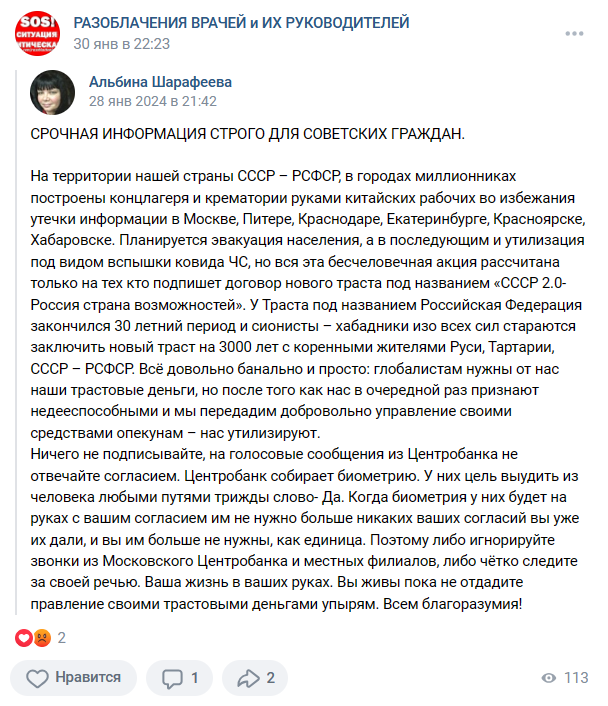 В сети гуляет «сенсация». Якобы в городах-миллионниках руками китайских рабочих были построены крематории и концлагеря. В этих машинах смерти якобы будут уничтожать ненужных россиян, которые отдали право на распоряжение своими трастовыми деньгами. Утилизация, как утверждают в постах, пройдет под видом вспышки коронавируса. Отдать это право гражданин может, когда трижды скажет «да» на звонок из Центробанка, то есть сдав таким образом биометрию. Трастовые деньги пойдут при этом в руки глобалистов и сионистов, которые намерены перезаключить траст «СССР 2.0 — Россия страна возможностей» на 3000 лет с коренными жителями Руси, Тартарии, СССР — РСФСР. Прошлый договор под названием Российская Федерация якобы истек после 30 летнего периода. Это очередная теория заговора, в которой сплелись несколько общественных страхов и конспирологических идей. Первое заблуждение связано с тем, что COVID-19 якобы придуман в Китае как биологическое оружие. Неоднократно доказывалось, что вирус не был создан в л