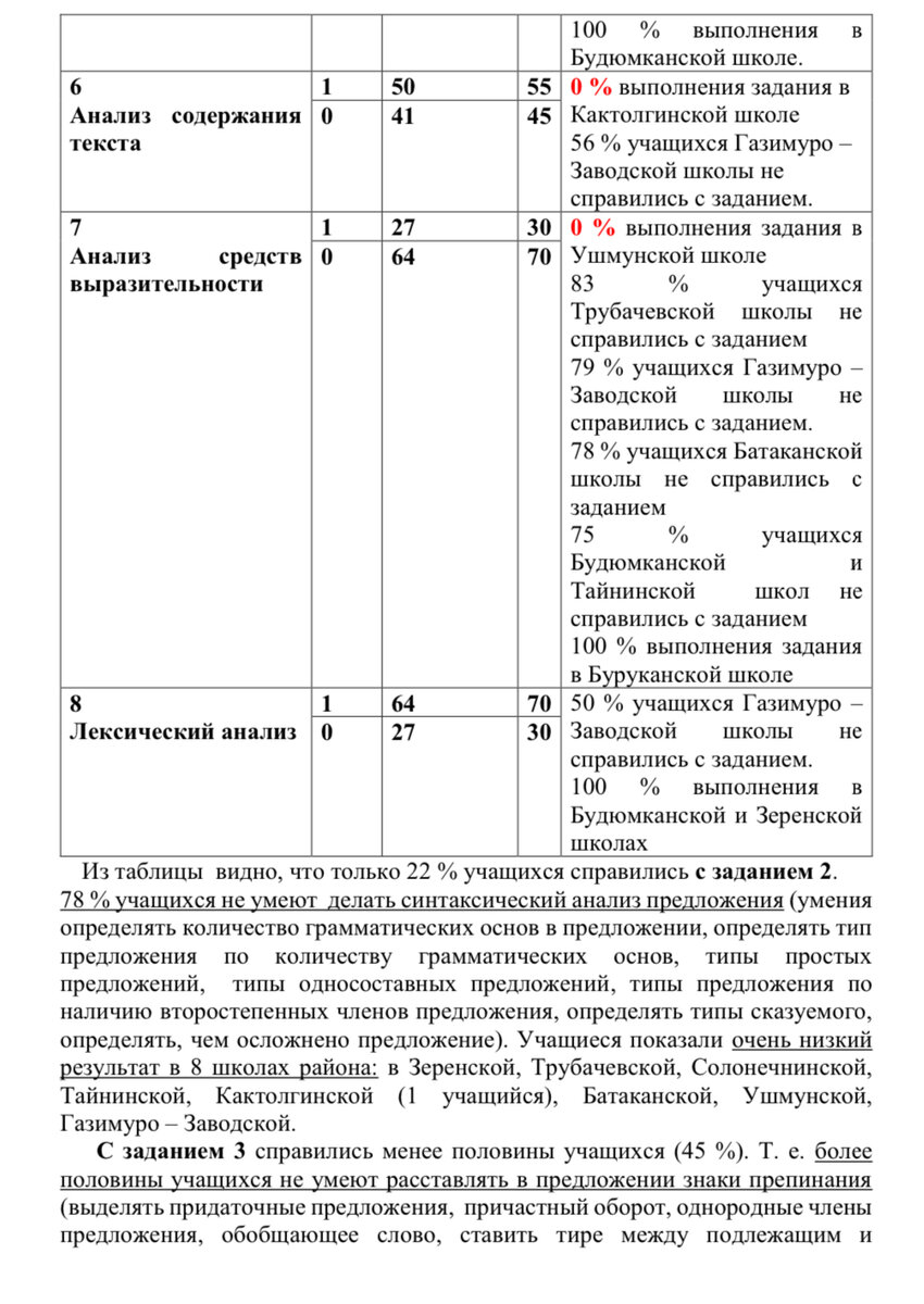 Менее половины учащихся 9 класса выполняют тестовые задания базовой сложности, остальная часть - более половины (56 %) - владеют базовыми навыками на низком уровне. Самый низкий уровень в Тайнинской школе - 21 %. Ученица Якимова Дина не справилась ни с одним из заданий 2 -8, хотя показала высокий результат при выполнении задания повышенного уровня и высший балл по критериям ГК1-ГК4 (грамотность). Учителю обратить внимание на результаты ребёнка и проработать каждое задание.