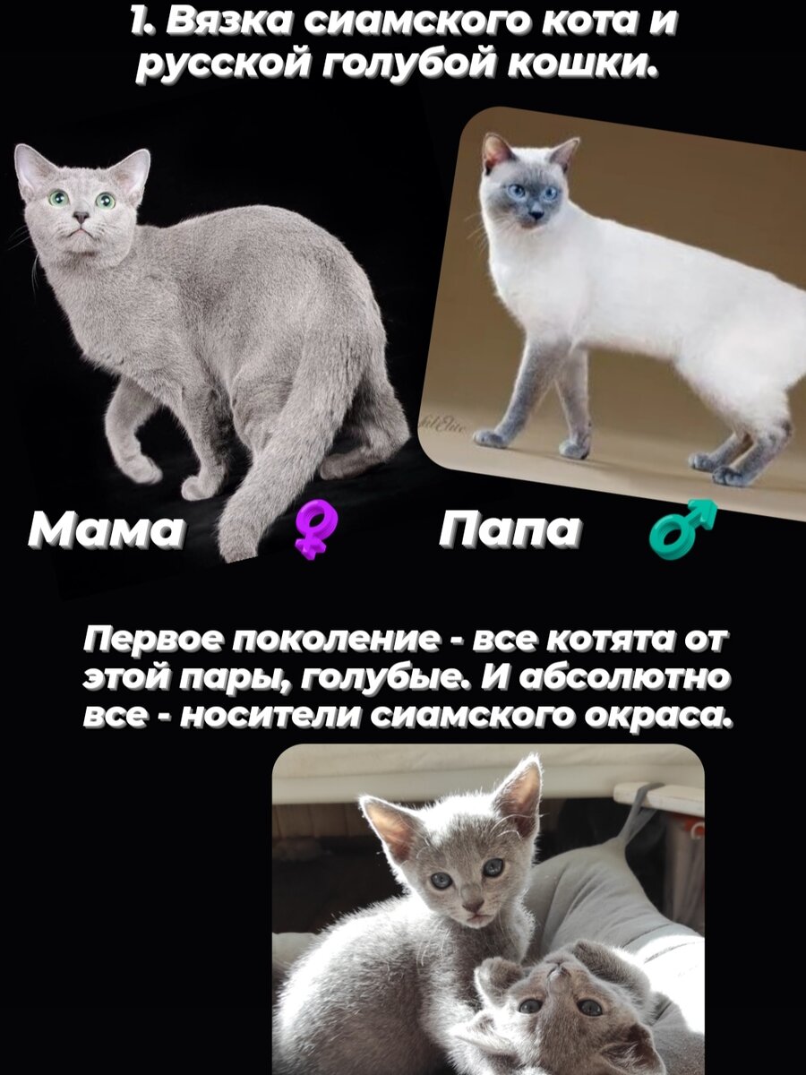 Немного генетики. Генетика окрасов кошки также проста, как и генетика окраса гороха. И тем не менее вопросы - а почему так долго рецессивный ген не покидает породу? - остаются весьма популярными. Давайте разберём всё в картинках. 1. Вязка сиамского кота и русской голубой кошки. Первое поколение - все котята от этой пары, голубые. И абсолютно все - носители сиамского окраса. 2 В генетике кошек буквой С обозначается окрас - Colorpoint (сиамский окрас). Большой буквой "С" обозначается солидный (равномерно распределённый )окрас. Он доминантный. Маленькой буквой "с" Обозначаются гены группы сиамских окрасов. Их несколько. 3. Далее у нас с вами образовалась пара двух русских голубых кошек голубого окраса, но они оба носители сиамского гена. Дети: СС, Сс, Сс, сс Котята СС и Сс - внешне неотличимы друг от друга. Кто из них носитель, а кто нет - неизвестно. 3. Пара русских голубых кошек, где носитель только один. Все котята голубого окраса. Внешне неотличимы друг от друга.