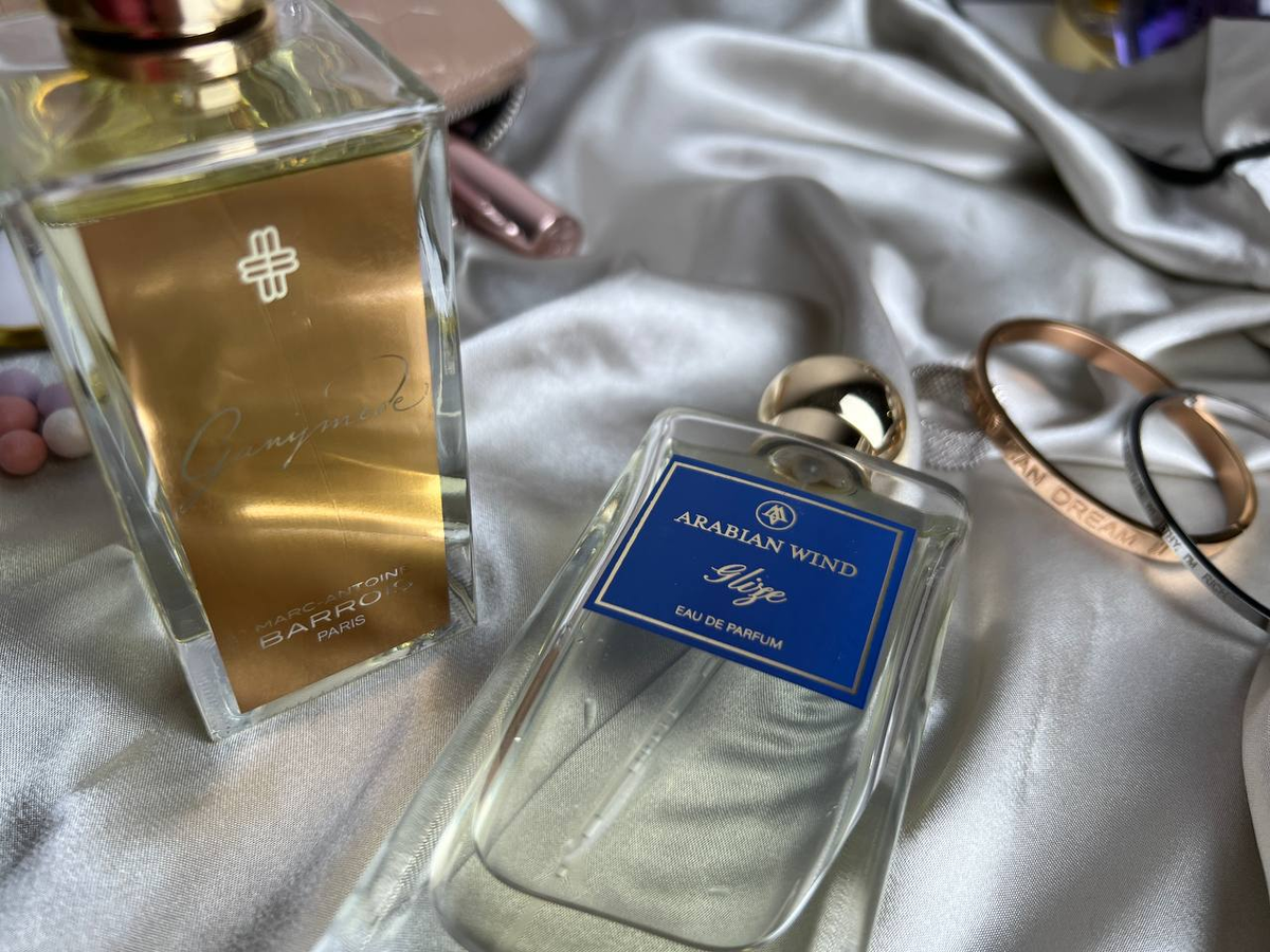 Сравнение хайпового Marc-Antoine Barrois Ganymede и его клона из ОАЭ - Arabian Wind Glize😉 Хочу пересмотреть свою знаменитую рубрику на канале с ароматами-близнецами. Времени много прошло, все похожие на популярные ароматы тщательно разносила, мнение откалибровала. Начать хочу со сравнения самого хайпового за последние четыре года аромата Marc-Antoine Barrois Ganymede и его арабского близнеца Arabian Wind Glize. Два года назад я говорила, что Ганимед в два с половиной раза дороже своего близнеца из ОАЭ. Сейчас перепроверила цены: Ганимед практически везде стоит 17900 руб. без учета скидок, а Глизе (75 мл) — 8200 руб. Разница в цене сократилась (теперь уже близнец в 2,2 раза дешевле), но инфляция на парфюмерию, конечно, поражает. Глизе полтора года назад стоил около 6000 рублей, уже когда нашу страну обложили всеми возможными санкциями. Ганимед у меня из той партии, что с правильным указанием содержания спирта, 73%. А вот Глизе из первых партий, попал мне в руки зимой 2022 года. Ну, б
