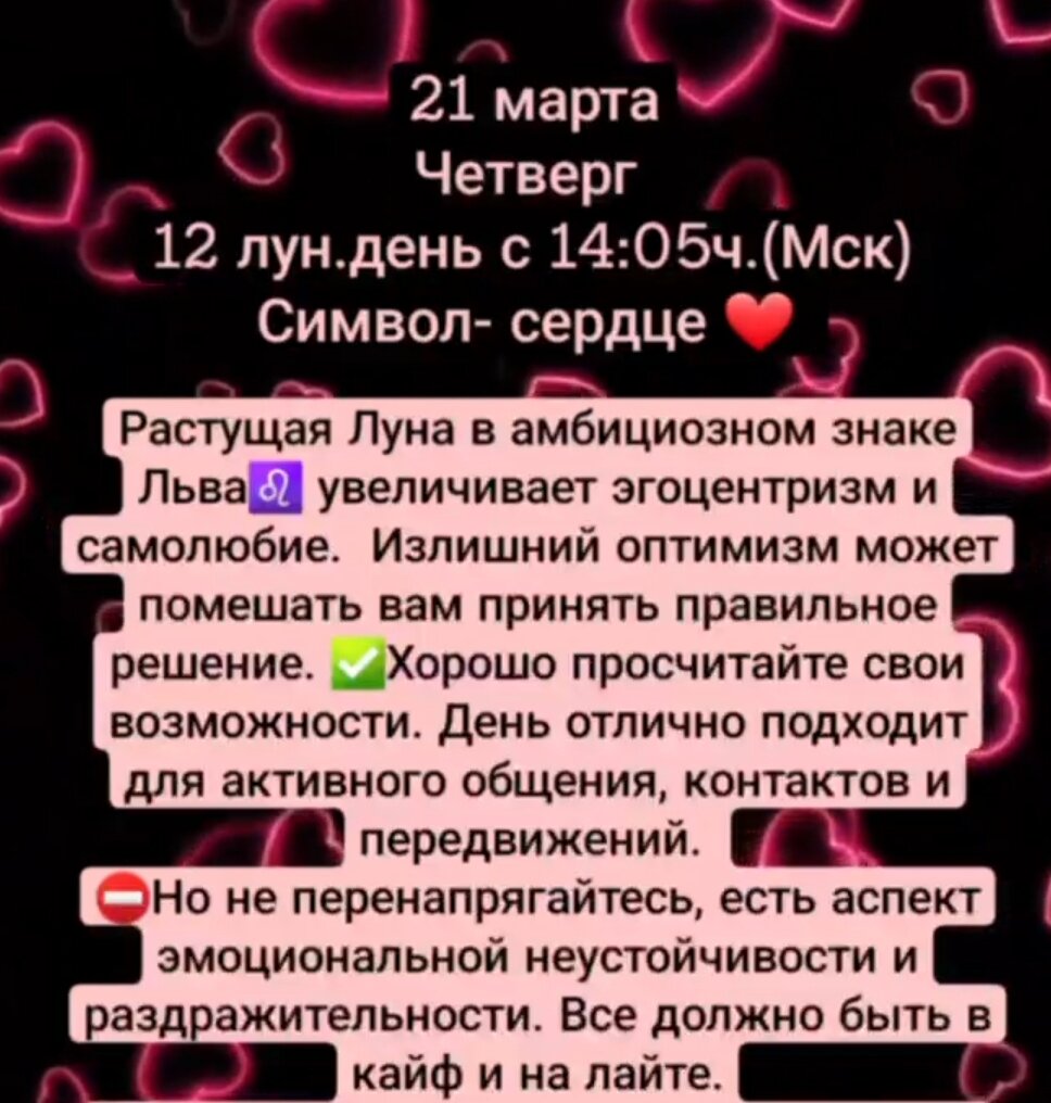 Растущая Луна в амбициозном знаке Льва♌️ увеличивает эгоцентризм и самолюбие. Излишний оптимизм может помешать вам принять правильное решение. ✅️Хорошо просчитайте свои возможности. День отлично подходит для активного общения, контактов и передвижений. ⛔️Но не перенапрягайтесь, есть аспект эмоциональной неустойчивости и раздражительности. Все должно быть в кайф и на лайте. 12 лун.день- день космической любви, победы мудрости над чувствами. Делайте добро, дарите подарки и будет вам счастье 💜#гороскоп #астрология #луна #астрологияонлайн #астропрогноз #овен #телец #близнецы #рак #лев #дева #весы #скорпион #стрелец #козерог #водолей #рыбы