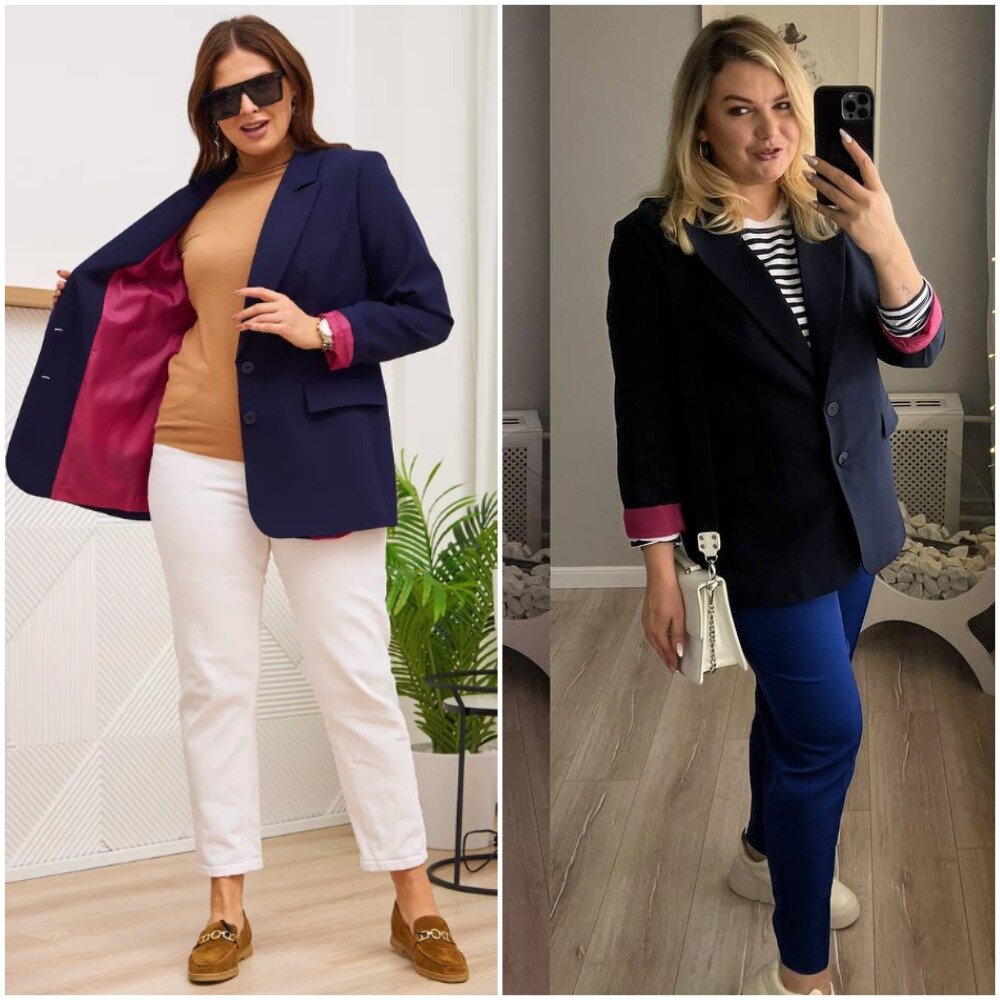 Здравствуйте, дорогие читатели! Меня зовут Марина, я - стилист PLUS SIZE, и на этом канале показываю одежду и аксессуары с Wildberries такими, как они есть, то есть, из серии "ожидание/реальность". Мои параметры: рост 170 см, вес 95 кг, 110-92-118 ✅Основной канал: Стилист PLUS SIZE Ставьте лайк в поддержку канала, и давайте смотреть на мою сегодняшнюю покупку. Этот стильный темно-синий жакет не так банален, как кажется на первый взгляд. Дело, конечно, в яркой подкладке, которую можно выпустить, чтобы добавить в свой образ яркий акцент. Сам же пиджак однобортный, застегивается на две пуговицы, есть глубокие карманы. Очень хорошая длина - и не короткий, и не слишком длинный. Модель приталенная, поэтому точно не будет сидеть мешком, а подчеркнет ваши изгибы. Хотя, конечно, все равно берем свободную посадку, чтобы жакет выглядел современно и стильно. Выполнен он из мягкой костюмной ткани. Такого же плана жакет есть и в других цветах, но я брала именно под брюки на фото, ну и также темно-си