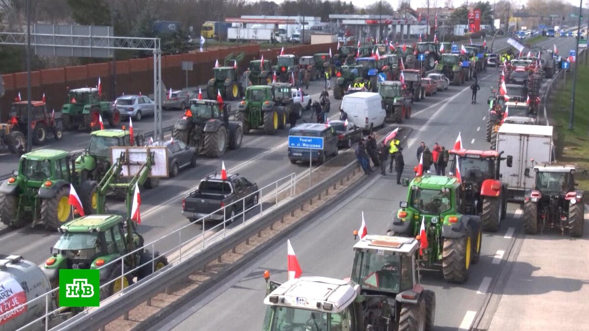 [ Смотреть видео на сайте НТВ ] Протестующие в Польше аграрии перекрыли дороги более чем в 500 местах по всей стране. В Польше парализовано автомобильное сообщение между крупными городами. Транспортный коллапс устроили местные фермеры, участвующие в общенациональной акции протеста. Они вывели на крупнейшие магистрали сельскохозяйственную технику. Польское телевидение со ссылкой на автоинспекцию сообщило, что тракторы и комбайны создали более 500 заторов по всей стране. Протестующие добрались даже до границы с Украиной, где на некоторое время перекрыли движение автобусов через КПП. Одной лишь блокировкой дорог фермеры не ограничились. В частности, спикер польского Сейма пожаловался, что участники акции насыпали огромную кучу навоза у дома его родителей. Примечательно, что власти страны не только не мешают крестьянам, но и сочувствуют им. Поддержку протестующим выразил президент Польши Анджей Дуда. Он считает требования фермеров законными. Фермеры хотят добиться прекращения ввоза в Польш