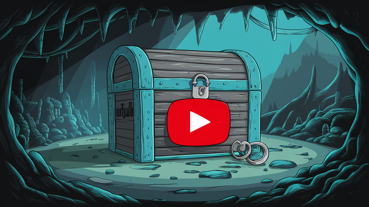большой сундук с логотипом ютуб под замком в мрачной пещере
