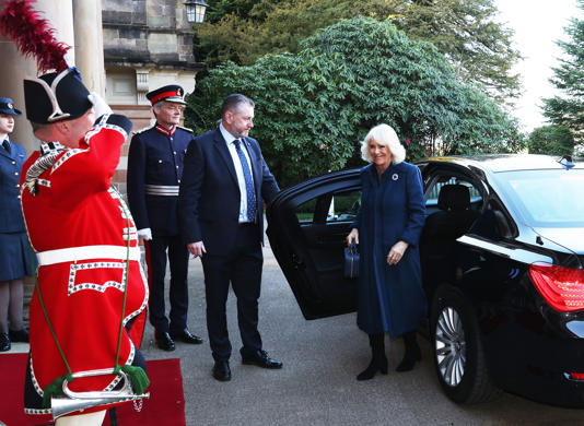 Королева Камилла прибыла в аэропорт Рональдсуэй около полудня и была встречена вице-губернатором острова Мэн сэром Джоном Лоримером. Он является представителем Короны на острове. Камилла прибыла в городской совет Дугласа около 12:30, и ее встретила мэр города Натали Байрон-Тир. Королева была одета в синее пальто и платье от Anna