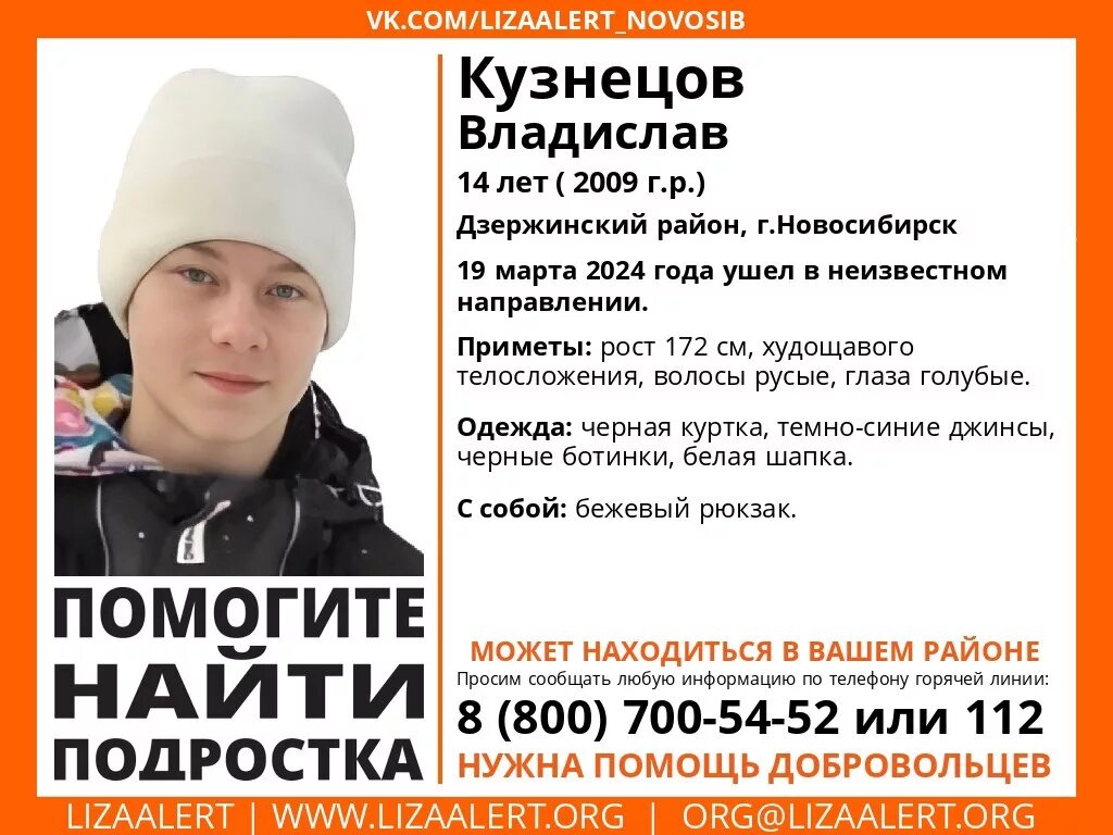 В Дзержинском районе Новосибирска пропал 14-летний Владислав Кузнецов. Как сообщает поисковый отряд «ЛизаАлерт», 19 марта 2024 года он ушел в неизвестном направлении. Приметы мальчика: рост 172 см, телосложение худощавое, цвет глаз голубой, волосы русые. Был одет в черную куртку, темно-синие джинсы, черные ботинки и белую шапку. С собой у него был бежевый рюкзак. Если вам что-либо известно о местонахождении пропавшего, сообщите по телефону горячей линии отряда 8-800-700-54-52 (круглосуточно, бесплатно) или 112. Ранее мы писали, что в Новосибирске пропал 17-летний Никита Габайдулин. Местонахождение подростка неизвестно с 28 декабря 2023 года. Вячеслав Зубарев