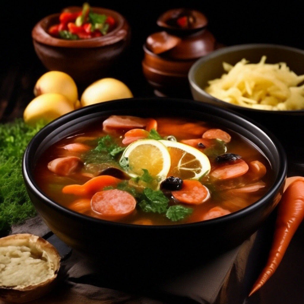Ингредиенты: Приготовление: Кипятим воду. Кладем туда очищенный и порезанный картофель. Тем временем нарезаем колечками несколько сосисок, обжариваем их на сковороде и отправляем к картофелю. Измельчаем лук, морковь трем на терке. Обжариваем овощи на растительном масле 10 минут. Добавляем томатную пасту, перемешиваем, накрываем крышкой и тушим 10 минут. Нарезаем кружочками маслины и солёные огурцы. Опускаем зажарку в кастрюлю. Через несколько минут кладем туда же маслины и огурцы. Перемешиваем и варим на тихом огне еще 20 минут. Если необходимо, досаливаем. Приятного аппетита!
