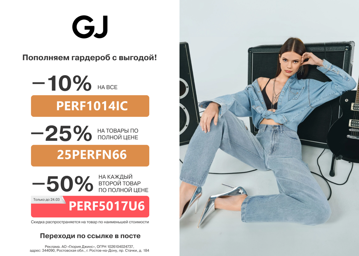 Заказать по ссылке https://glorjeans.prfl.me/promiki2023/70n2dr?erid=2Vtzqug2Bcx Реклама. АО «Глория Джинс», ОГРН 1026104024737, адрес: 344090, Ростовская обл., г.Ростов-на-Дону, пр. Стачки, д.184