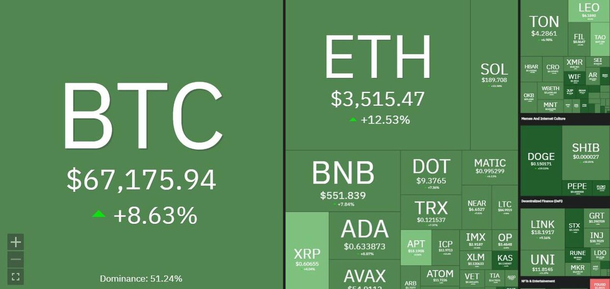 После того как вчера BTC протестировал локальный минимум на уровне 60 760$, его цена восстановилась на 10% и поднялась выше ключевой поддержки около 65 000$. Катализатором роста стало заседание ФРС и выступление Джерома Пауэлла. Как и ожидалось ставку оставили на старом уровне 5,50%, но комментарии Пауэлла дают надежду на первое снижение ставки уже в июне. Глава ФРС сказал, что последние данные по инфляции, которые превысили прогнозы, кардинально не повлияют на политику ФРС и они по-прежнему будут ожидать снижения этих показателей, а также чиновники ФРС ожидают увидеть минимум 3 снижения ставки в этом году и вероятность на снижение в июне составляет целых 70%. Тем временем ETF продолжают фиксировать отток капитала, по данным Farside, 20 марта общий отток составил $261 млн. Но это меньше чем днем ранее, что может сигнализировать о снижении продаж ETF Grayscale.