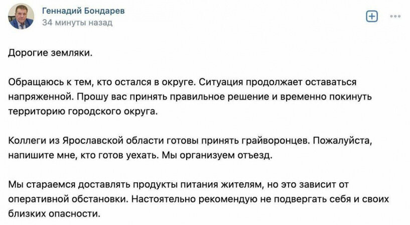 Глава Грайворонского района Геннадий Бондарев рассказал, что жителей приграничных населенных пунктов готовы временно разместить в Ярославской области. Мэр попросил связаться с ним, чтобы администрация организовала отъезд из района. «Мы стараемся доставлять продукты питания жителям, но это зависит от оперативной обстановки. Настоятельно рекомендую не подвергать себя и своих близких опасности», — написал Бондарев на своей странице в соцсети «ВКонтакте». Через некоторое время он удалил публикацию. Главная новость по теме Из Белгородской области после обстрелов эвакуируют девять тысяч детей
